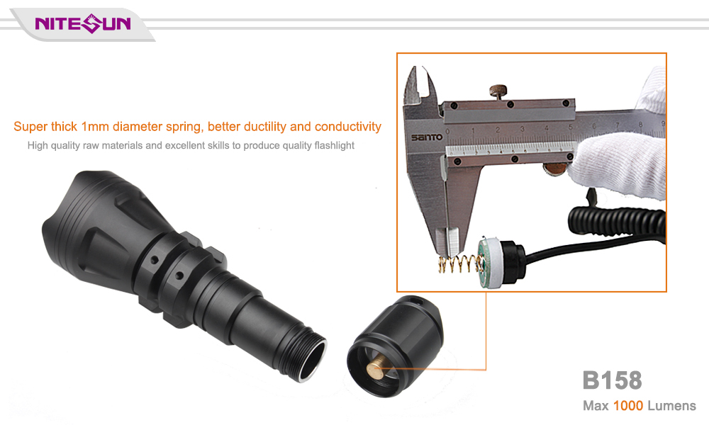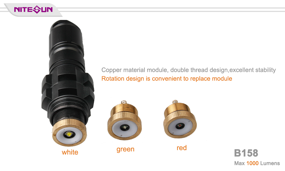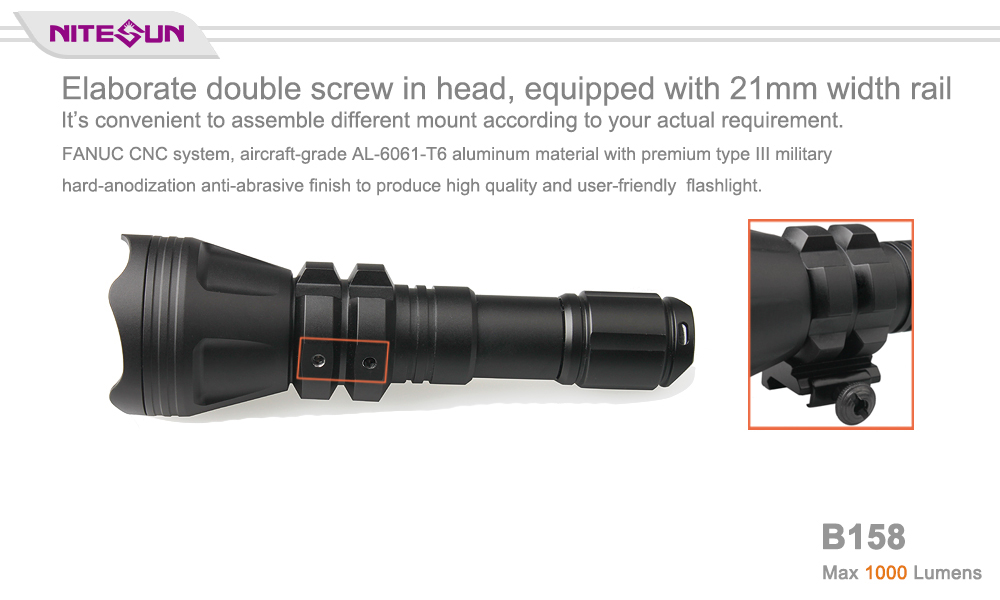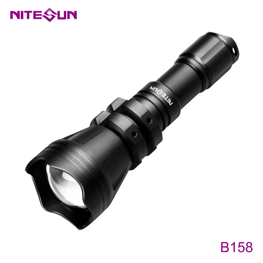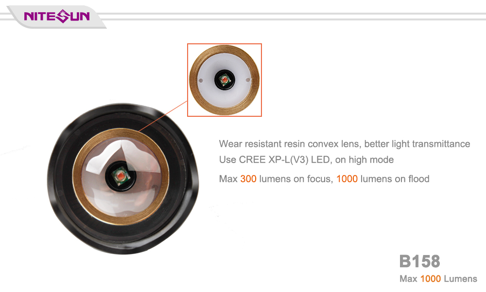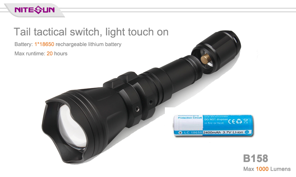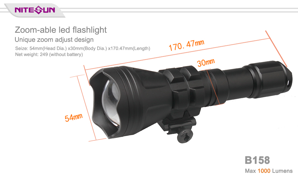 Nitesun B158, our most popular led zoom-able flashlight use the newest CREE XPL-V3 LED, max 300 lumens output on focus and 1000 lumens output on the flood. This flashlight use aircraft-grade AL-6061-T6 aluminum material with premium type III military hard-anodization anti-abrasive finish to produce high quality and user-friendly flashlight. Rotating body to zooming design is convenient to reality use and replace different color led module. Tail tactical switch and waterproof IP68, this zoom adjustable flashlight is a good choice for your outdoors, hunting, and tactical lighting.