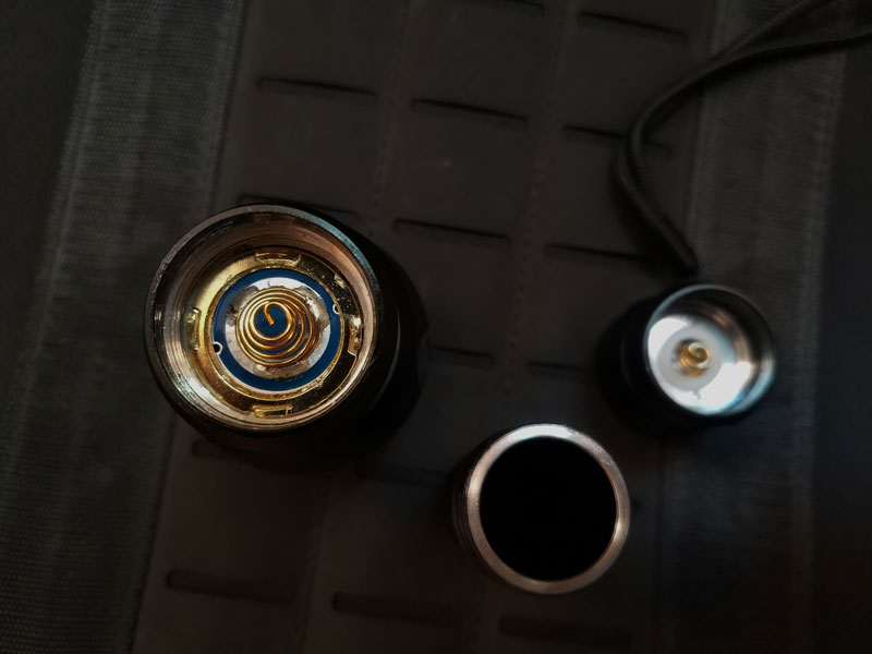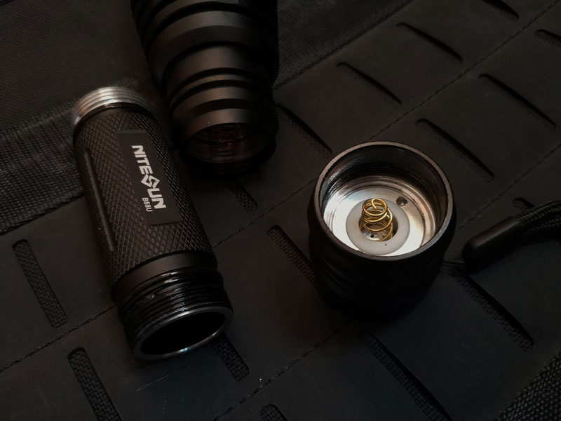 手电采用常规的结构,即筒头、筒身、尾盖。每个位置的拧合处采用了矩形螺纹设置。这是长效稳定的螺纹方式。正负极导电触点均采用了镀金的工艺处理。一次达到了极佳的导电性和长效的使用周期。