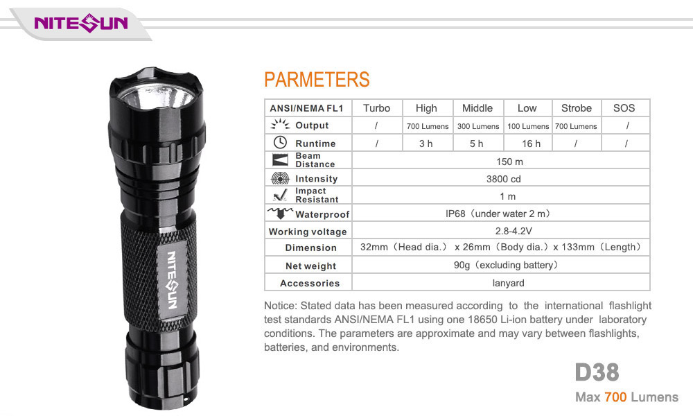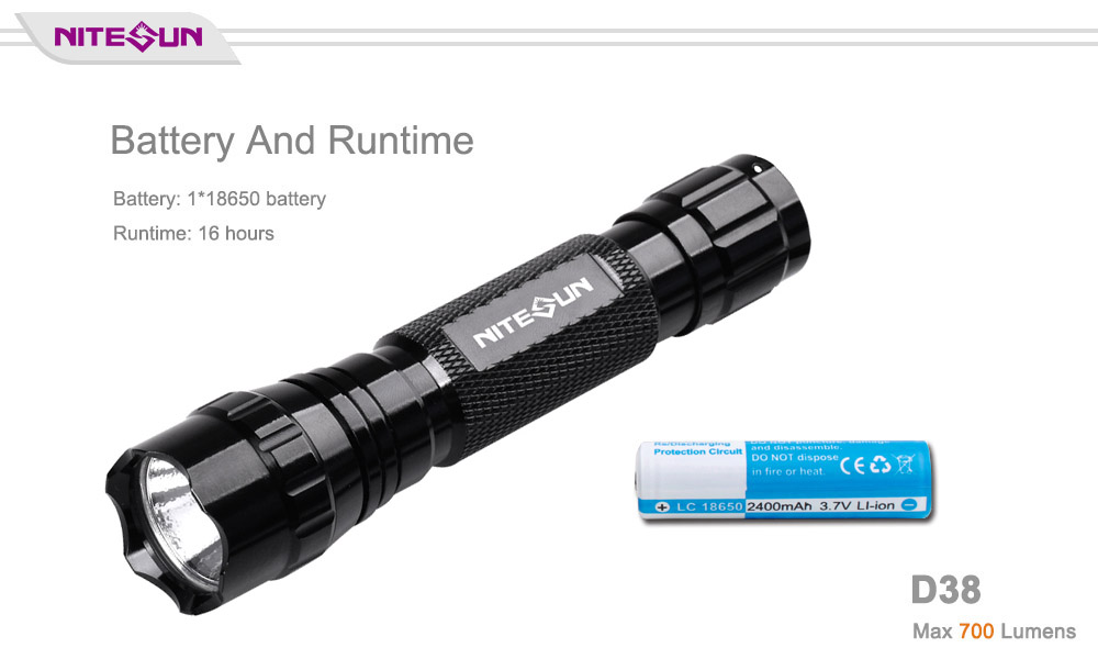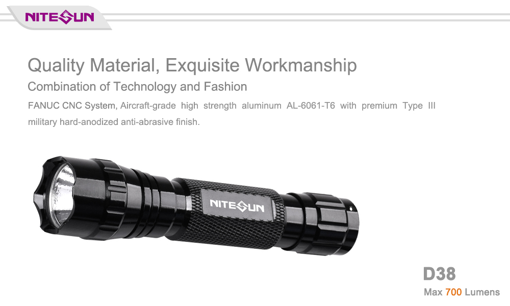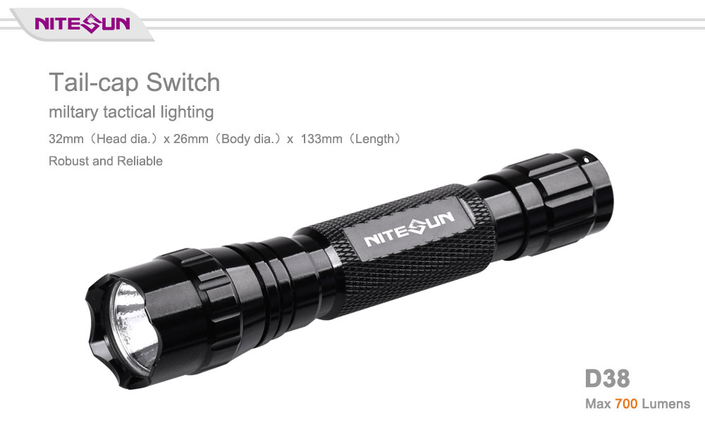 Nitesun D38 tactical flashlight uses one CREE XM-L2(U4) LED and can reach max 700 lumens output. This flashlight is powered by one 18650 battery with max 16 hours run time. The tail-cap switch design, it’s easy to operate. IP68 standard waterproof features and 150 meters long beam distance, Nitesun D38 is one of your best choices for military, security and outdoor lighting. Custom service for mode, package, and accessories are available.