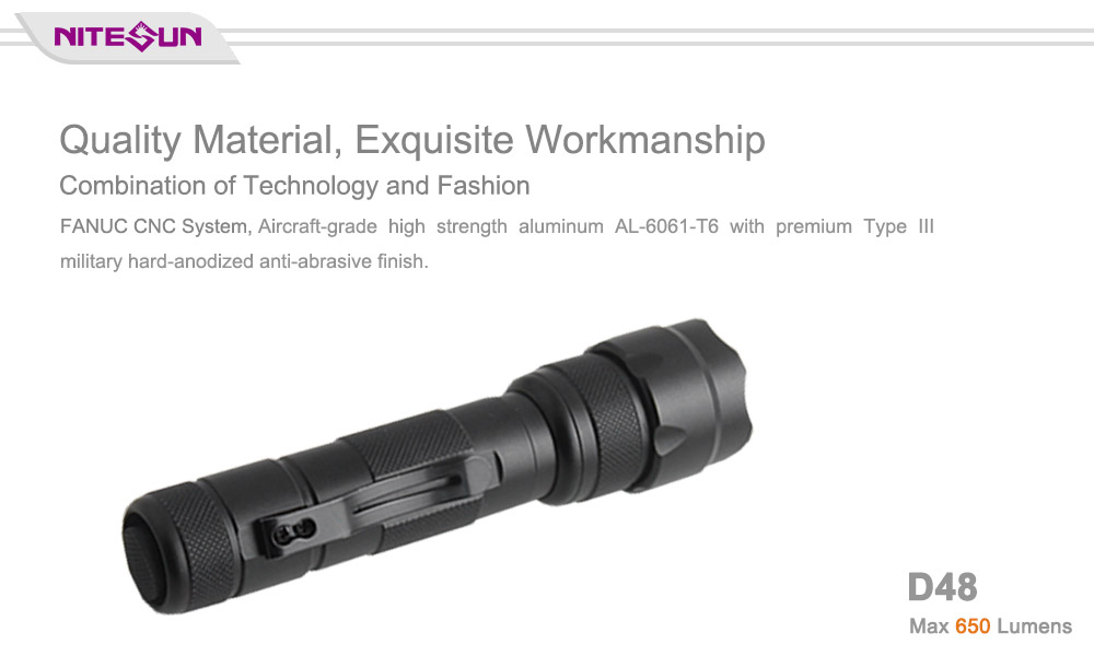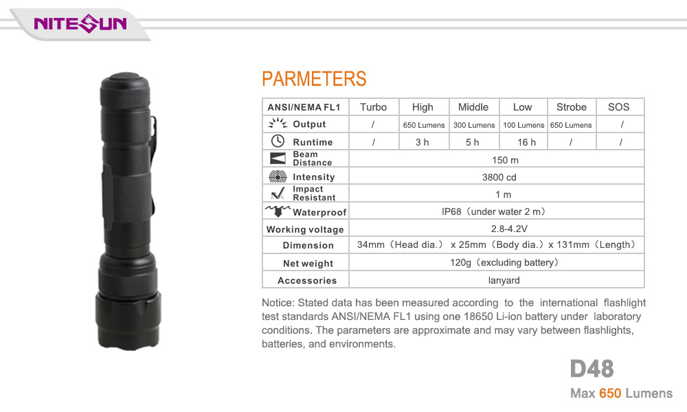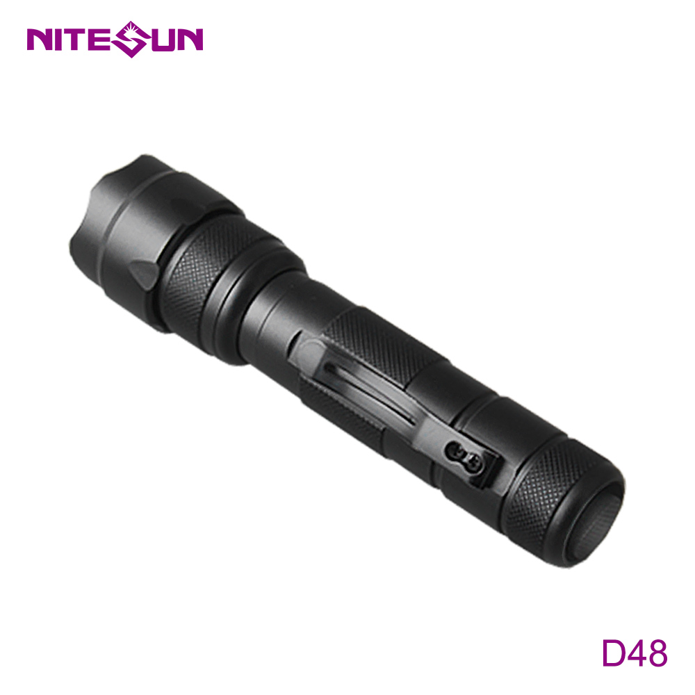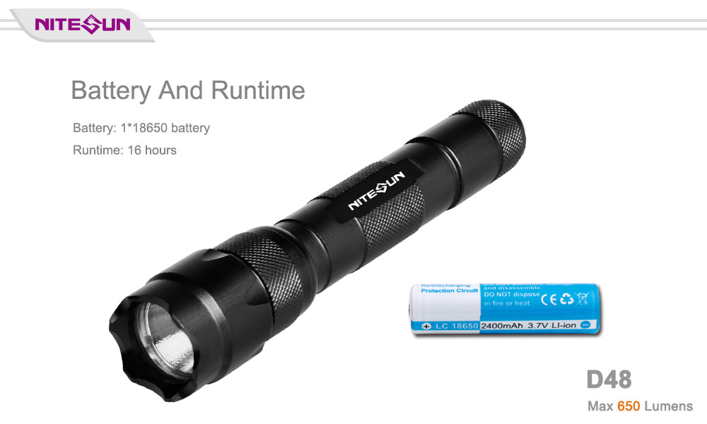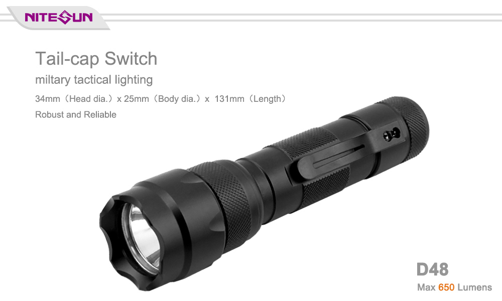 Nitesun D48 police security flashlight uses one CREE XM-L2(U4) LED and can reach max 650 lumens output. This flashlight is powered by one 18650 battery with max 16 hours run time.The tail-cap switch design, it’s easy to operate. IP68 standard waterproof features and 150 meters long beam distance, Nitesun D48 is one of your best choice for military, security and outdoor lighting. Custom service for mode, package and accessories are available.